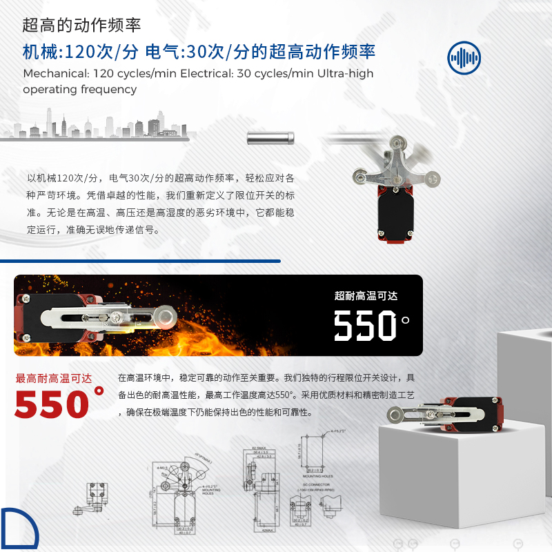 凱基特耐高溫行程開關(guān)具有以下優(yōu)點(diǎn):超位報(bào)警,安全可靠,接觸檢測,磨損小。耐高溫最高可達(dá)550℃。鋁合金外殼 高機(jī)械強(qiáng)度,防護(hù)等級IP67 耐油、防水和防壓結(jié)構(gòu)。